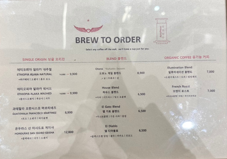 싱글오리진, 블렌드, 유기농 커피로 나뉘어 있었어요