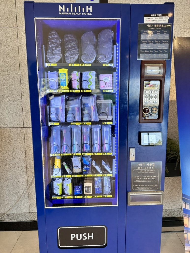 자판기에는 슬리퍼, 칫솔, 샤워용품, 클렌징티슈,